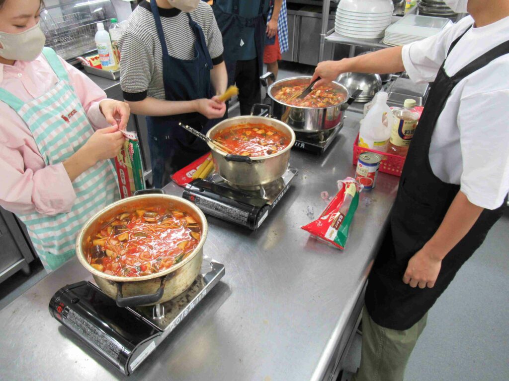 状態を想定して各ユニット毎に昼食を調理。献立はトマト缶のスープパスタ。