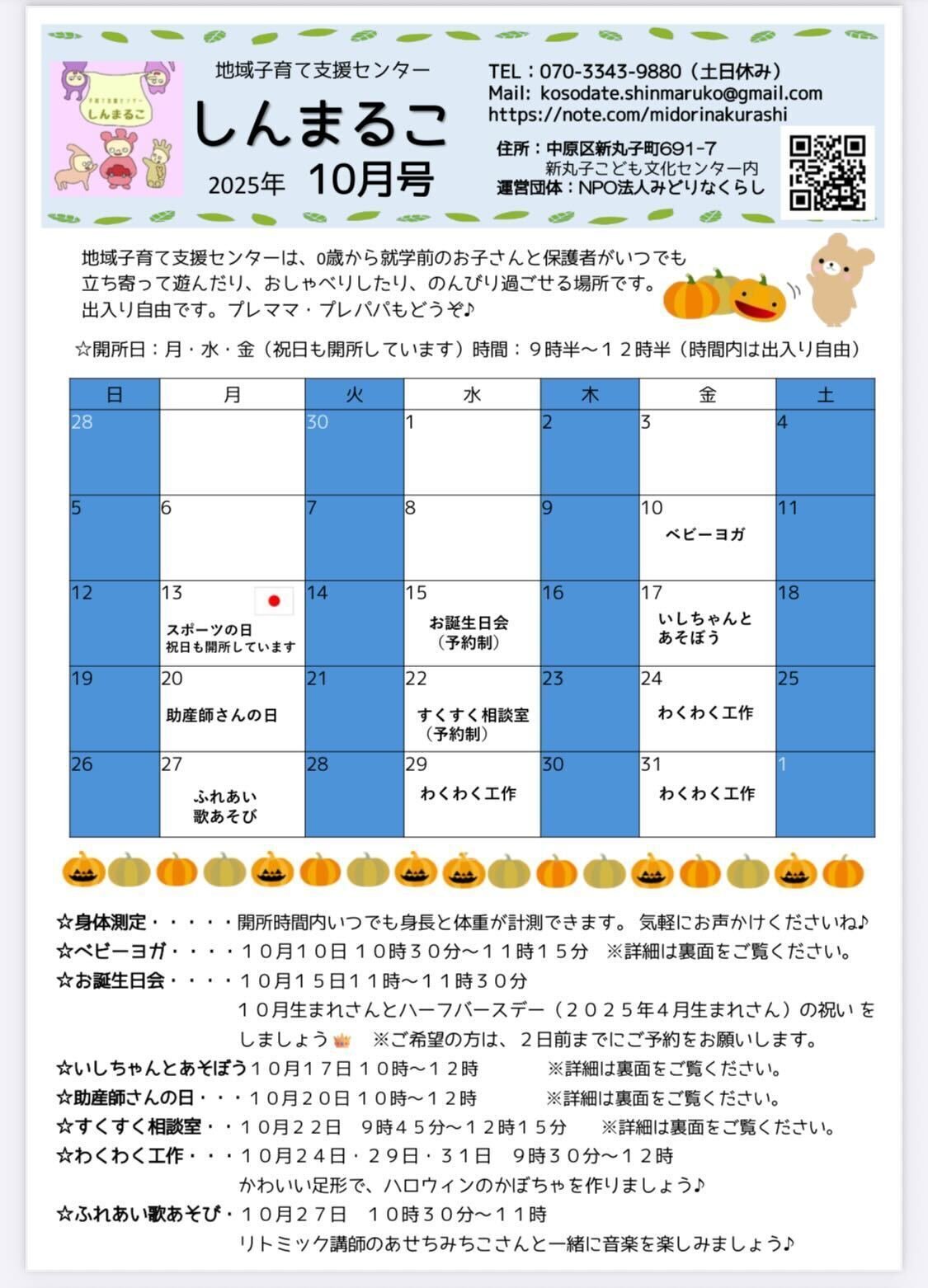 10月22日㈬ 地域子育て支援センター しんまるこ にて【すくすく相談室】を開室します。子育てに関する悩みだけでなく、ご家族のこと、ご自身に関することのご相談もお受けしています。                     お問い合わせ・ご予約は下記のお便りをご参照いただくか、地域子育て支援センター しんまるこ に直接お問い合わせをお願いします。