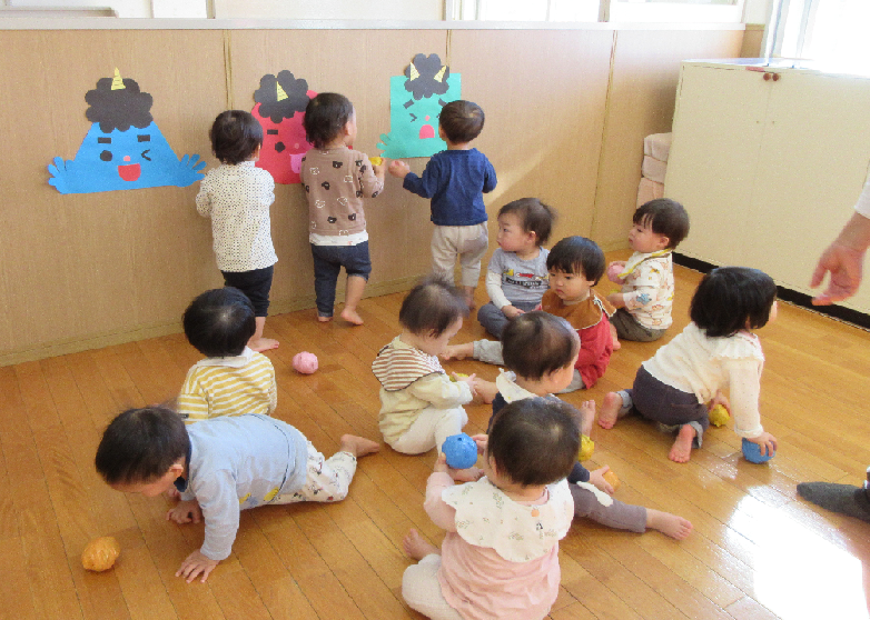 0歳児クラスには鬼さんは来ませんが、壁に作り物の鬼さんを貼って