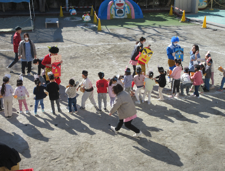園庭には「おには~そとっ!」「ふくは~うちっ!」と元気な声が響いていて、